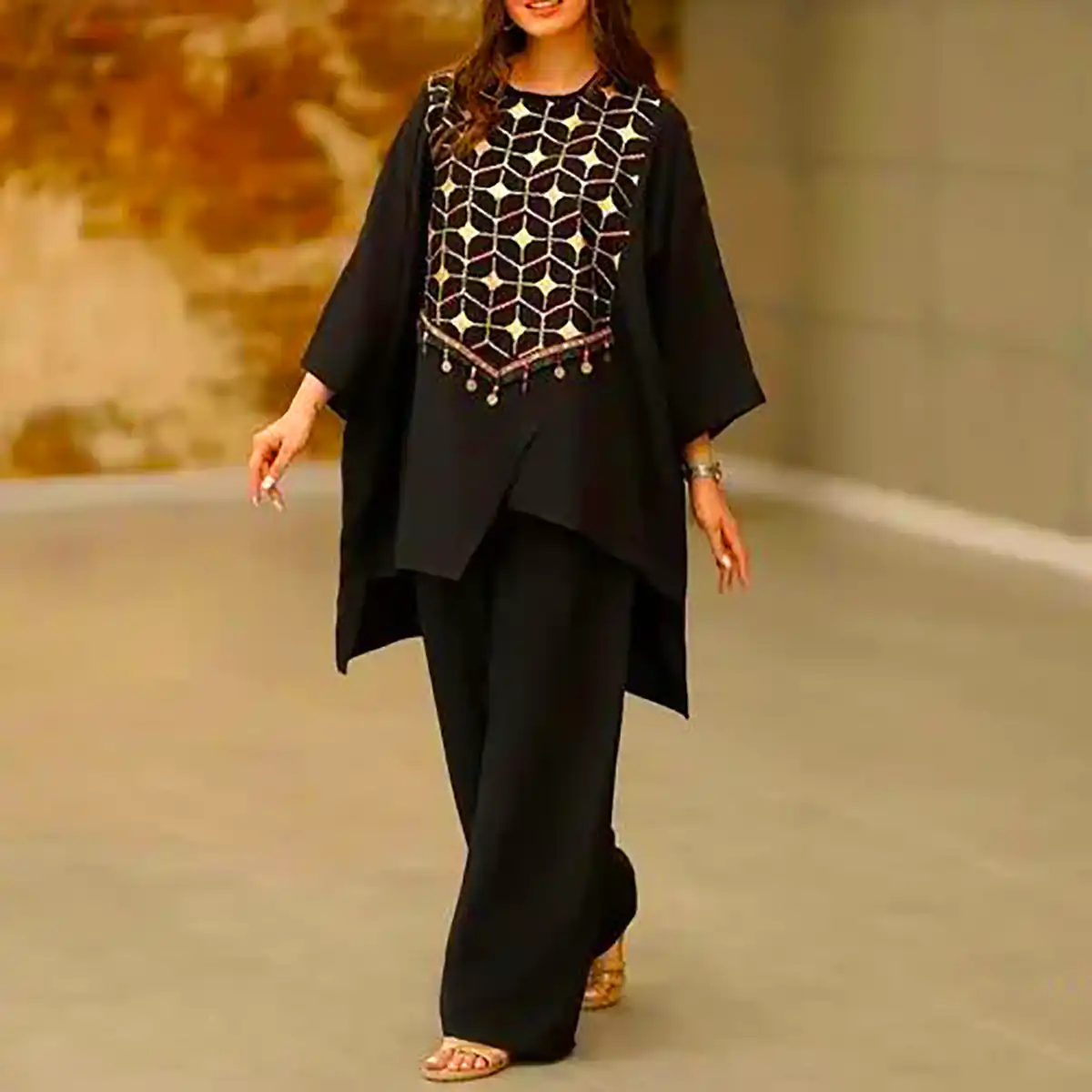 طرحهای گشاد با یقههای تزئینی و پارچههای ابریشمی که ظاهری لوکس و مجلسی دارند.